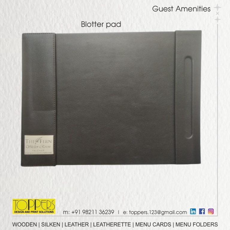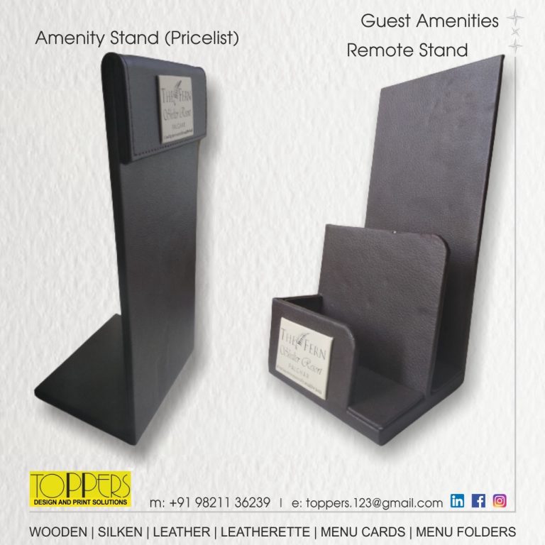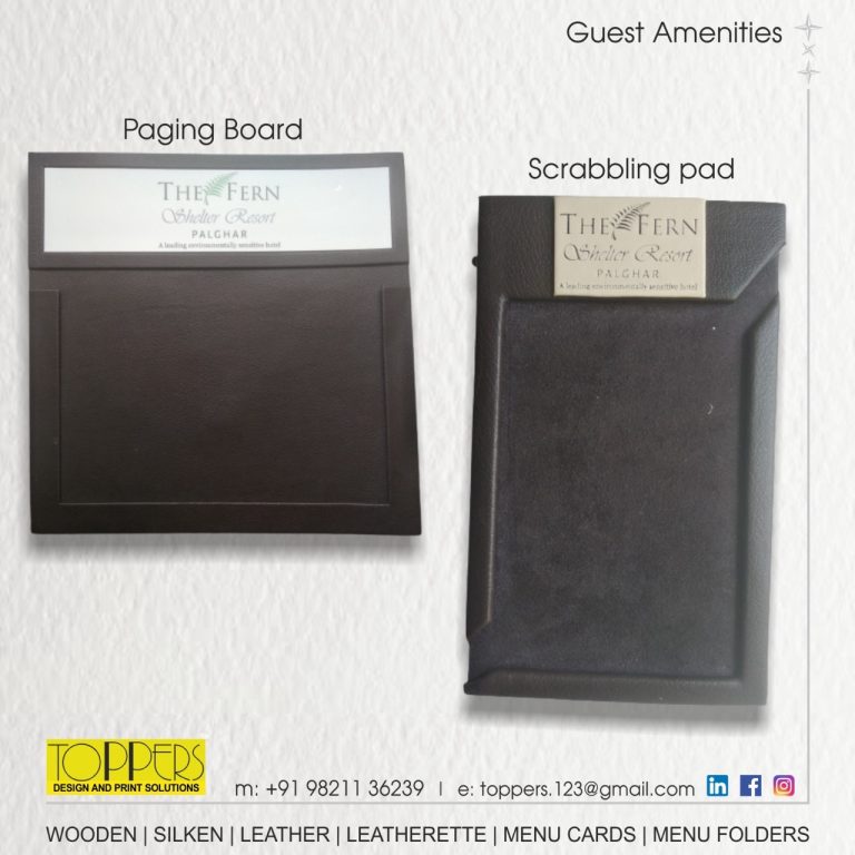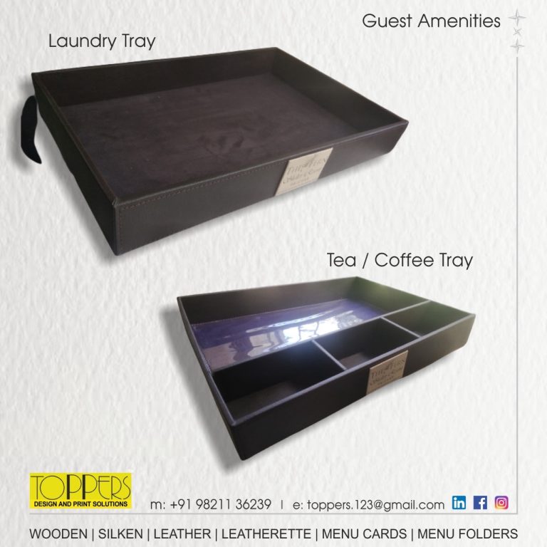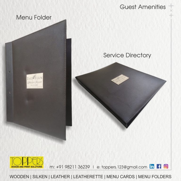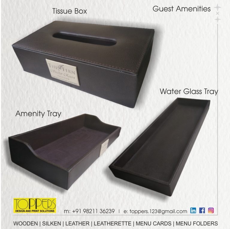 Toppers… The name you can trust for an upscale range of Menu Folders, Menu Cards, Bill Folders, Amenities Tray, Dustbins, Room Services Directory, Tissue Boxes, Coasters, Remote Holders in Leather or Leatherette.